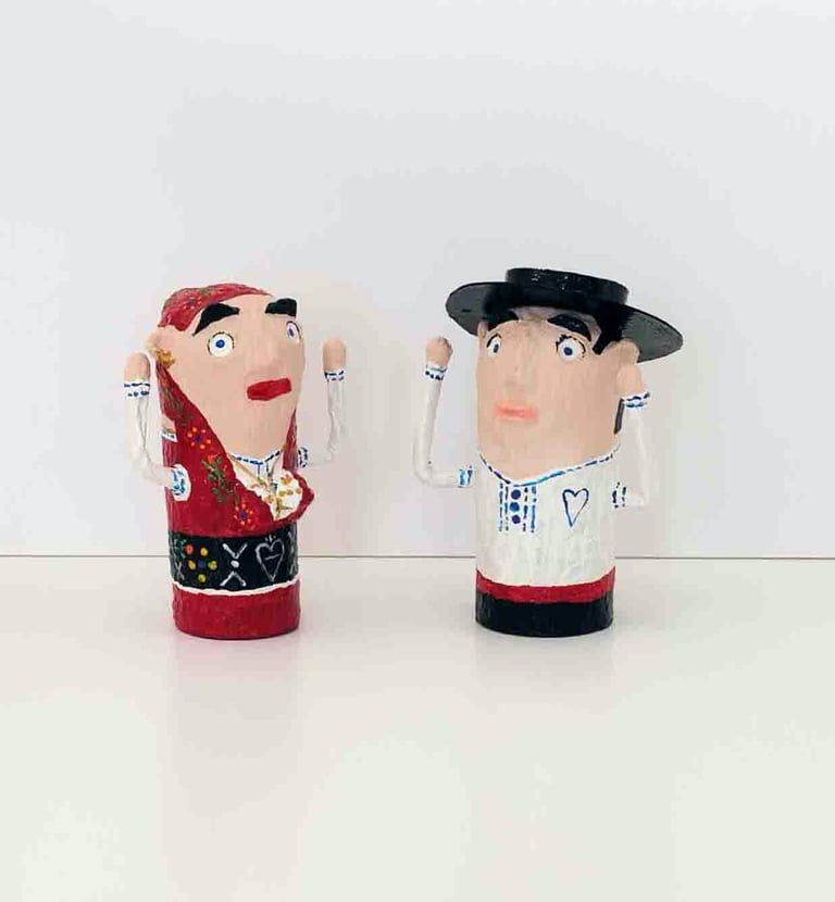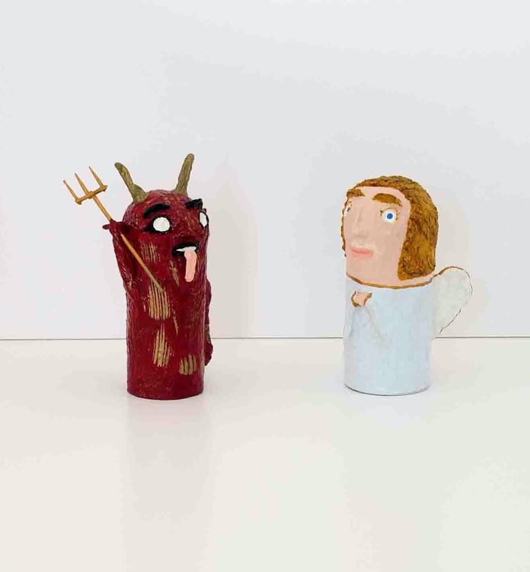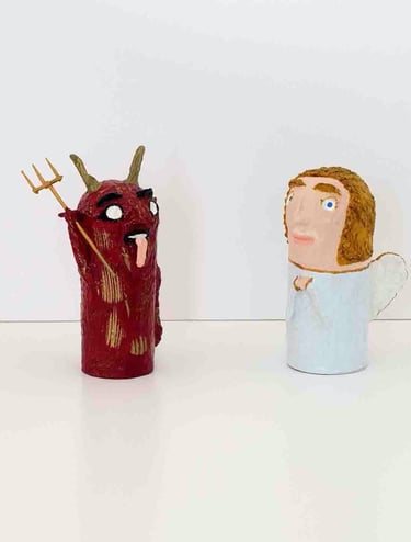 Anjo e Diabo em pasta de papel produzidos por Papeludos.