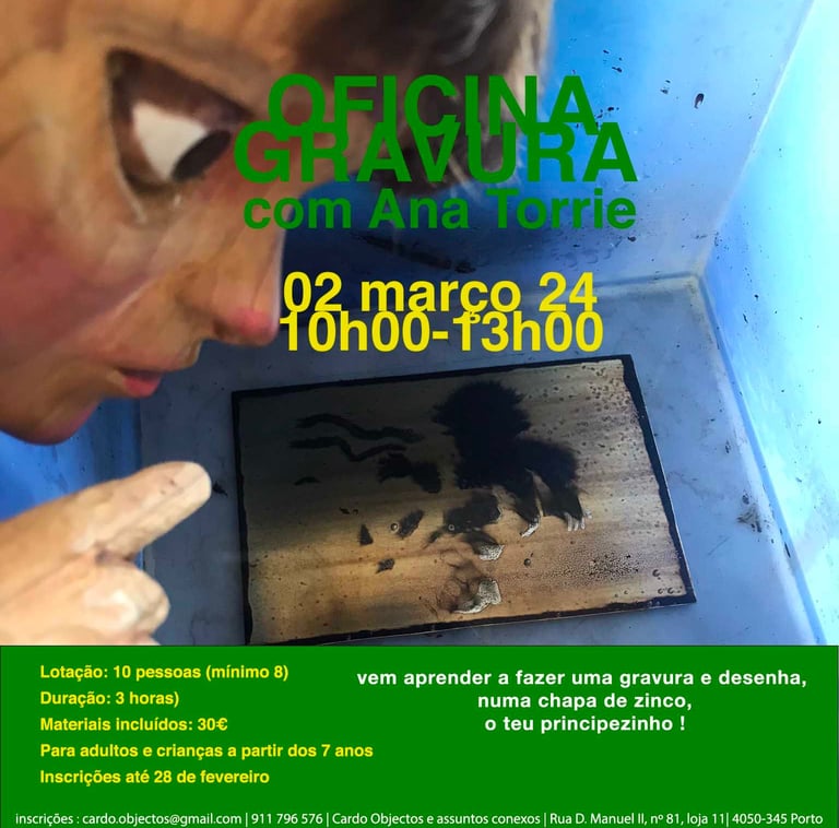Aprende como fazer uma gravura com matriz em chapa de zinco. Neste workshop vem aprender a fazer uma gravura e desenha numa chapa de zinco o teu principezinho. Fica a conhecer todo o processo de criação de uma gravura, desde a gravação à impressão.